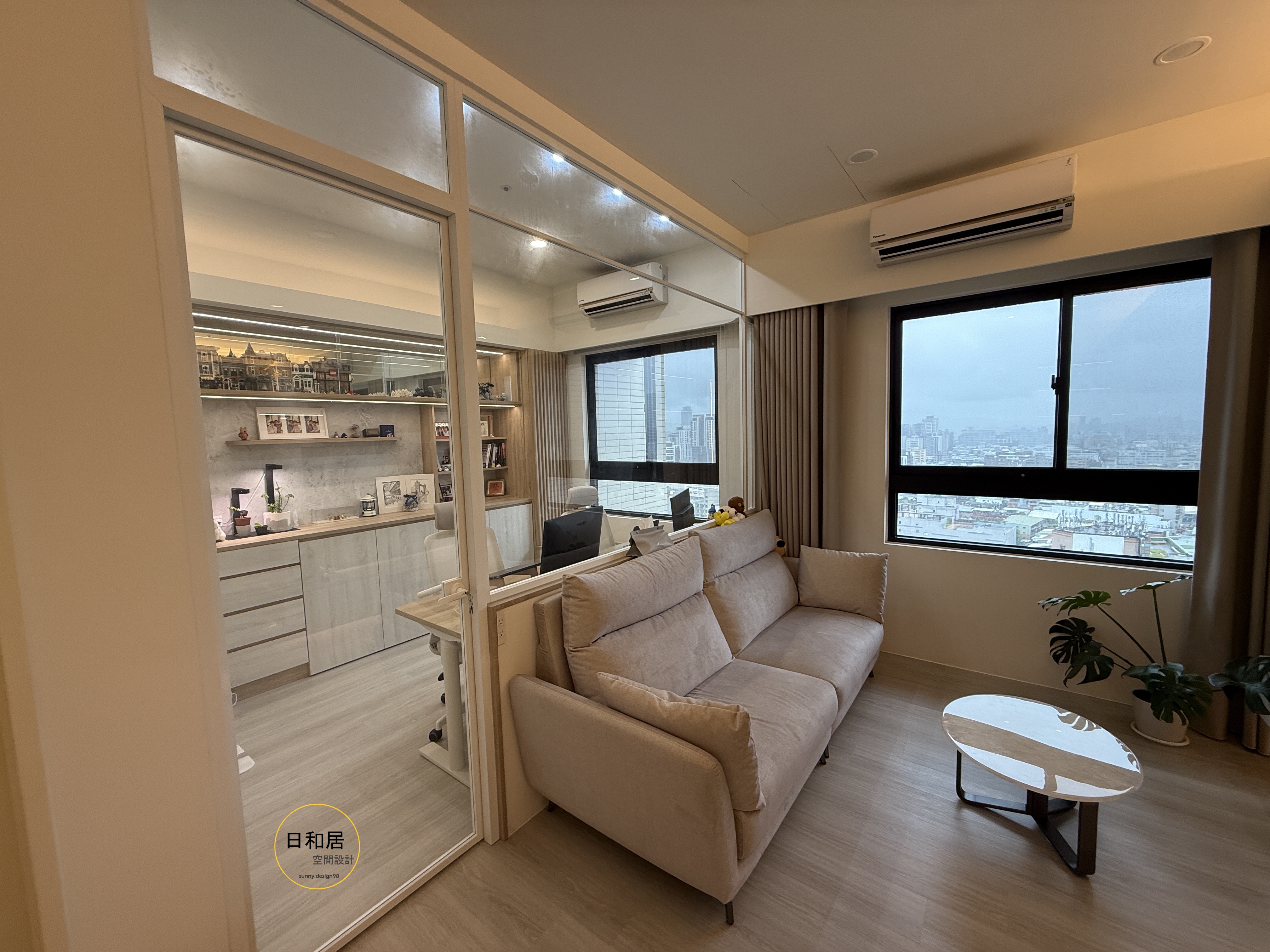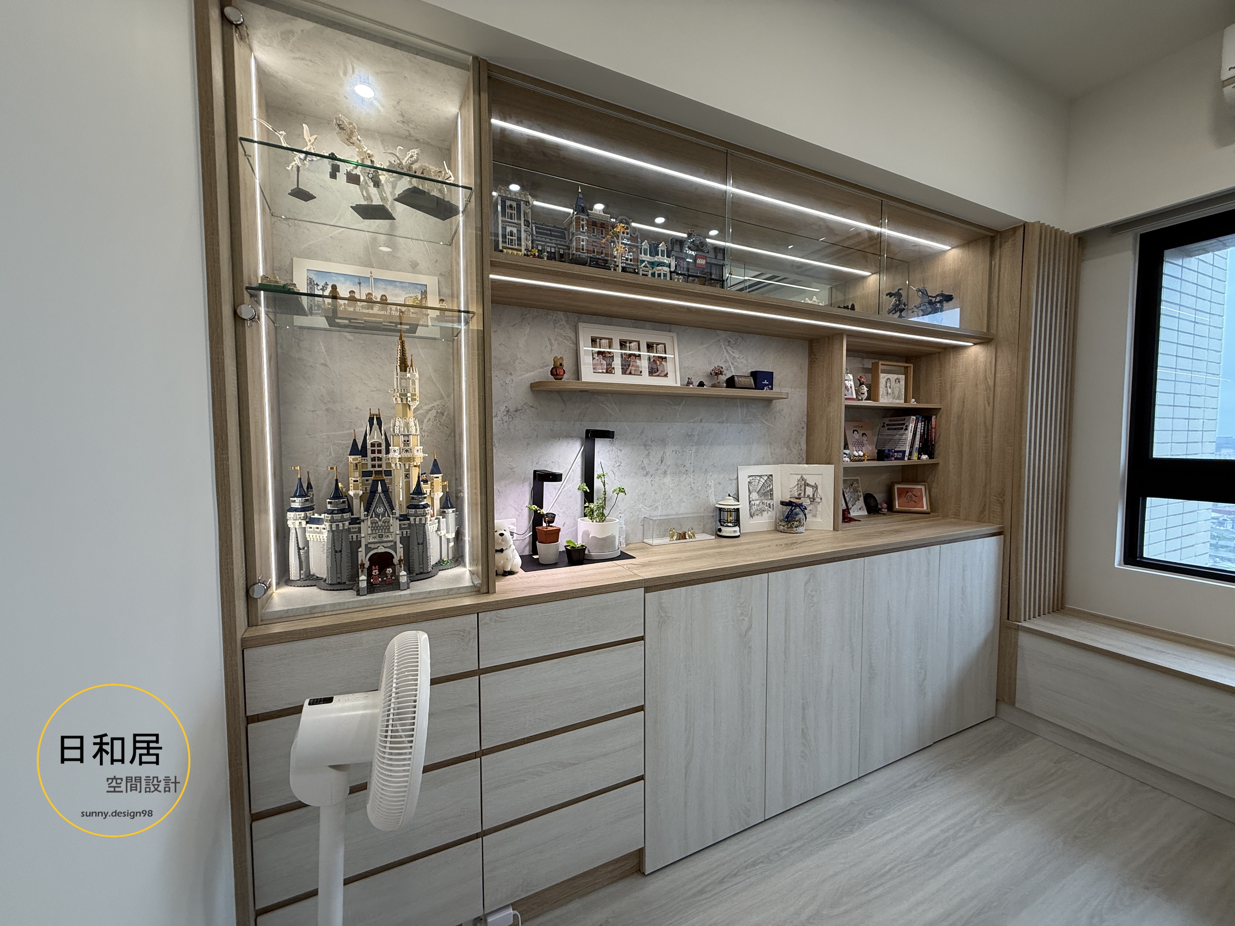 特殊:半透明玻璃隔間、斯曼特藝術塗料、制震壁空間運用、樂高收藏展示櫃設計、工程師夫妻專屬的小天地